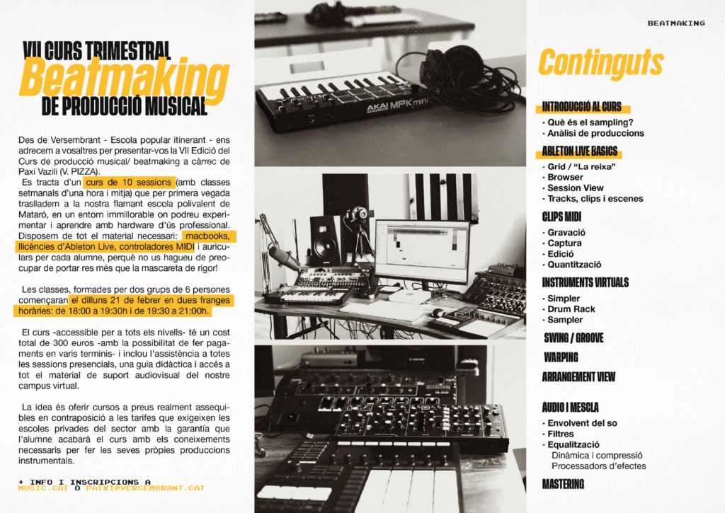 Es tracta d’un curs de 10 sessions (amb classes setmanals d’una hora i mitja) que per primera vegada traslladem a la nostra flamant escola polivalent de Mataró, en un entorn immillorable on podreu experimentar i aprendre amb hardware d’ús professional. Disposem de tot el material necessari: macbooks, llicències d’Ableton Live, controladores MIDI i auriculars per cada alumne, perquè no us hagueu de preocupar de portar res més que la mascareta de rigor!