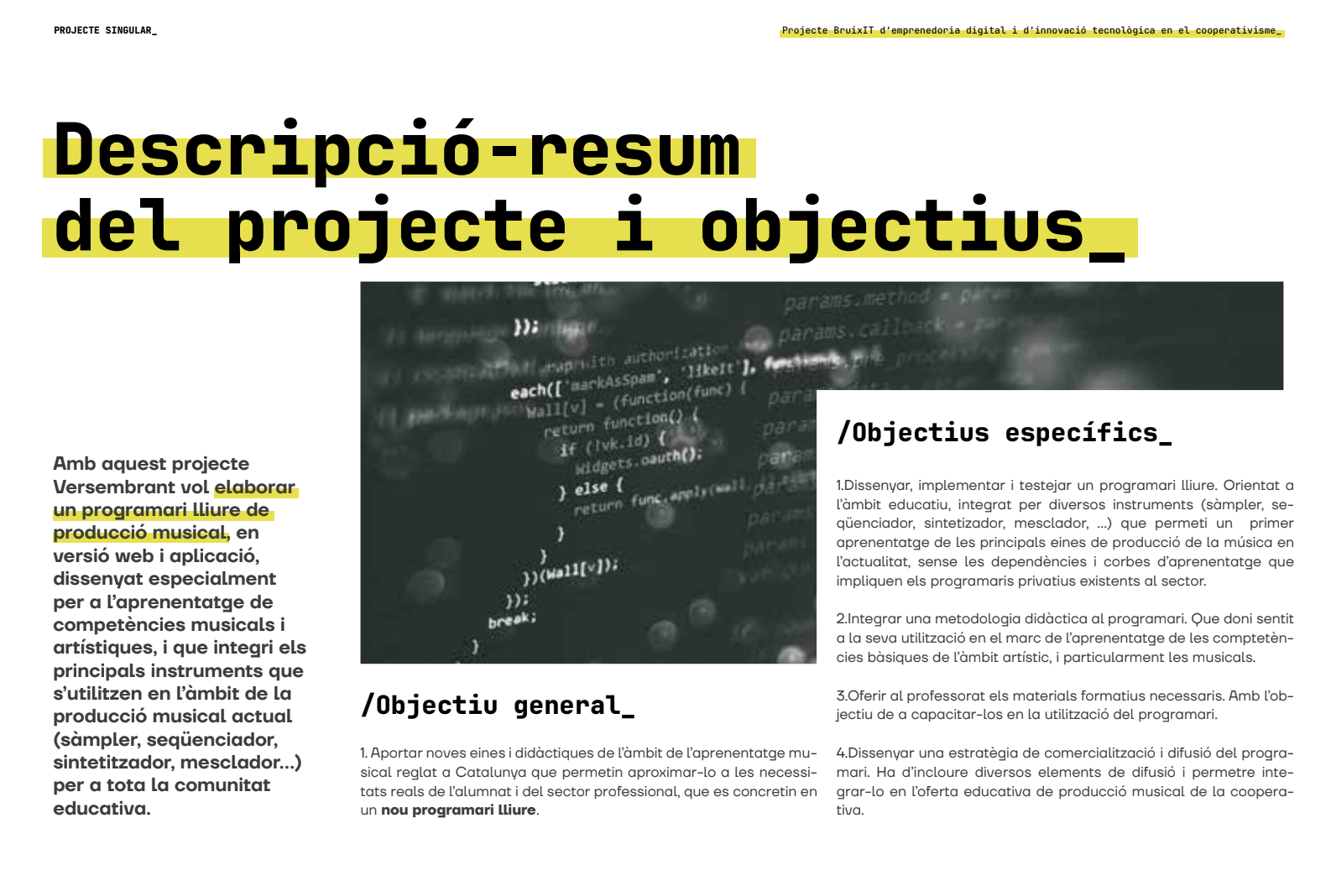 L’objectiu principal del projecte és aportar noves eines i didàctiques en l’àmbit de l’aprenentatge musical reglat a Catalunya que permetin donar sortida a les necessitats reals de l’alumnat i del sector professional. Volem aportar una nova metodologia didàctica que a través de la producció musical, es puguin impartir els continguts curriculars musicals: identificació d’escales, tonalitats, harmonia, melodia, ritme, capacitat d’anàlisi i reflexió, desenvolupament creatiu, identificació de patrons musicals, aproximació a la història de la música…
