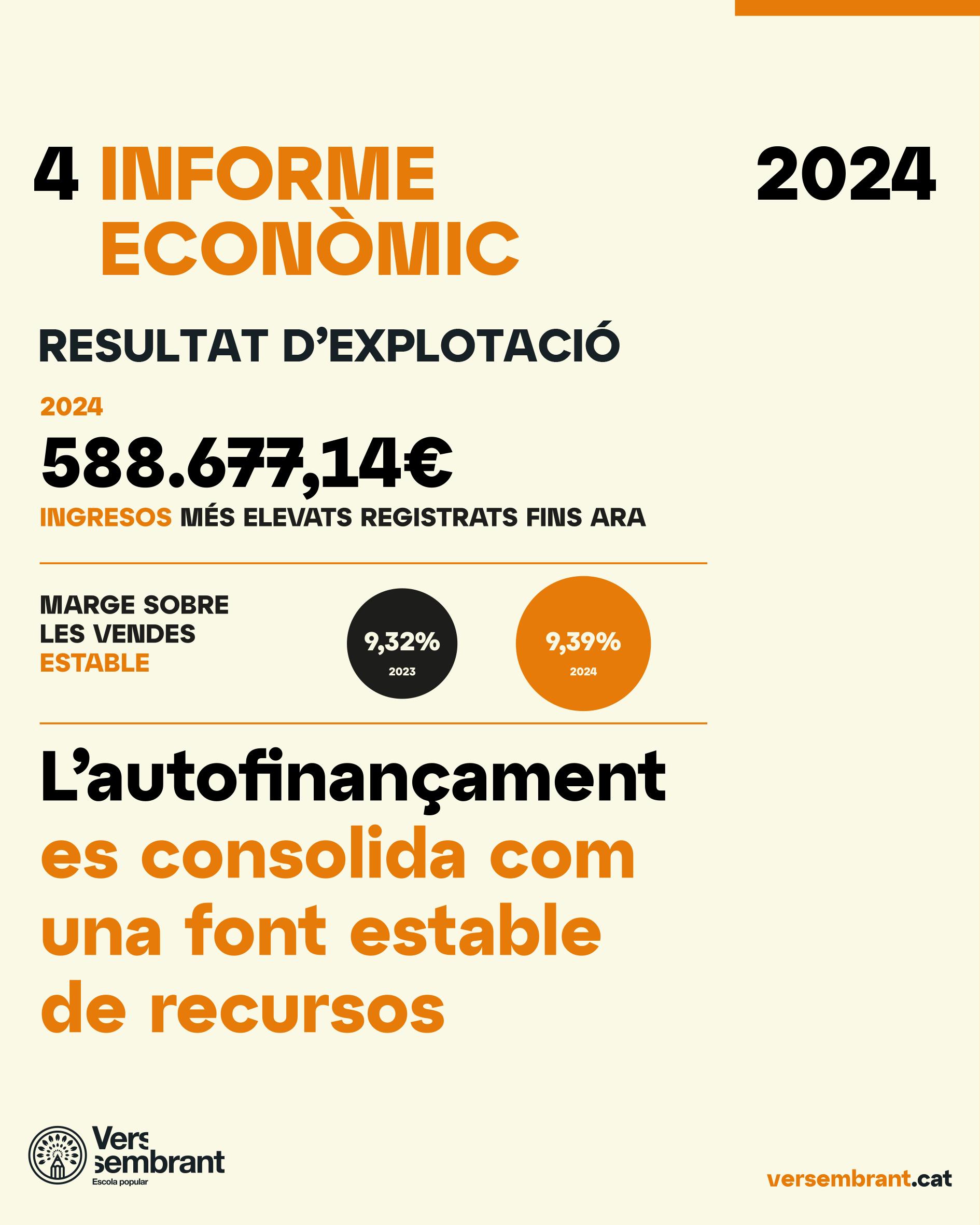 Tanquem l’any amb una estructura sòlida i sostenible: ingressos rècord de 588.677,14 €, resultat d’explotació positiu de +33.149,60 € i 60,69% d’ingressos no subvencionats. Les subvencions no substitueixen l’activitat pròpia; la complementen i enforteixen dins un model econòmic mixt, estable i solvent. Mantenim resultats positius des de 2020, sense endeutament significatiu, i amb capacitat d’autofinançament per afrontar millores salarials, inversions pedagògiques i desenvolupaments tecnològics.