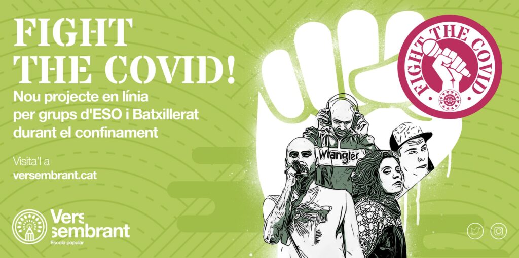 Degut al context actual de confinament, amb l’aturada total del curs lectiu presencial, i sense previsió de reprendre’l a curt termini, “Fight the Covid!” planteja la possibilitat d’apropar els fonaments bàsics d’una tècnica social dels sentiments -el rap- a l’alumnat confinat. En línia, treballant de manera transversal aprenentatges teòrics i pràctics d’escriptura poètica, de creativitat i -sobretot- d’expressió emocional, oferint un espai per canalitzar l’angoixa i els dubtes dels joves derivats de l’actual situació de crisi sanitària, econòmica i social. Com venim treballant amb molts vosaltres, ja sabeu que és sobretot mitjançant la creativitat com els éssers humans transformem els nostres malestars.